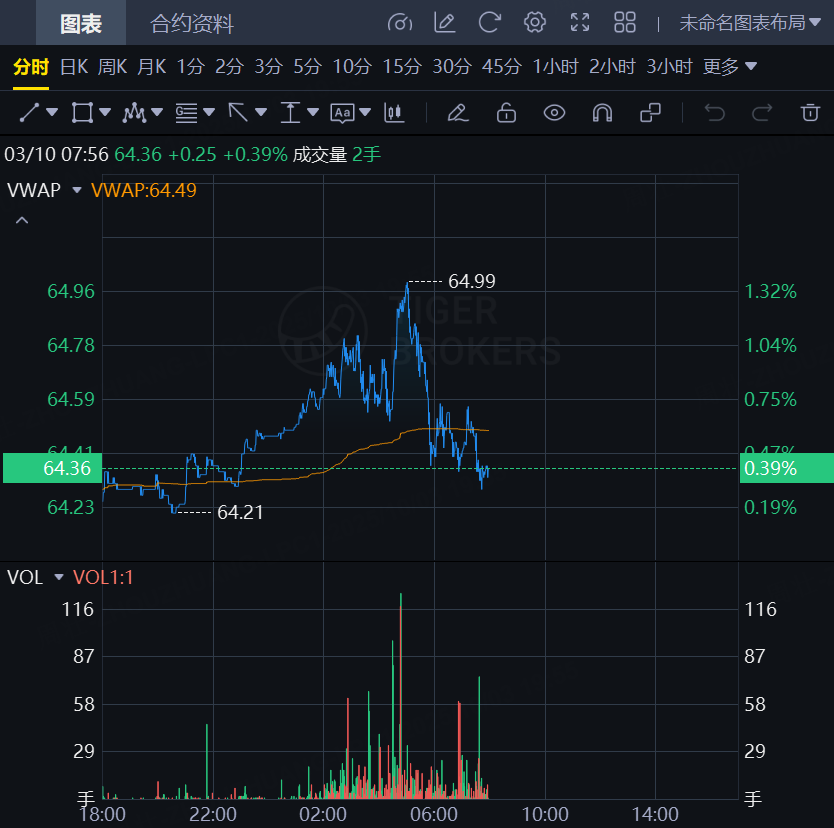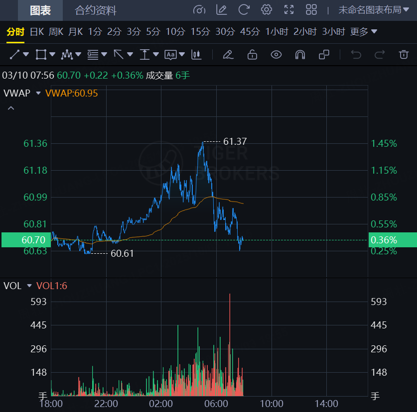原油期貨漲幅收窄,截止發稿,WTI原油漲0.36%,報60.7美元/桶;布倫特原油漲0.39%,報64.36美元/桶。