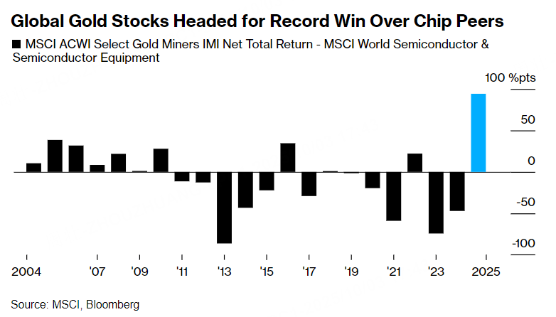 摩根士丹利資本國際公司(MSCI Inc.)衡量全球黃金股票的指數今年已飆升約135%,追隨貴金屬的漲勢。該指數有望創下有史以來的最大漲幅,超越該指數編制機構衡量全球主要半導體公司的指數,後者已上漲40%。