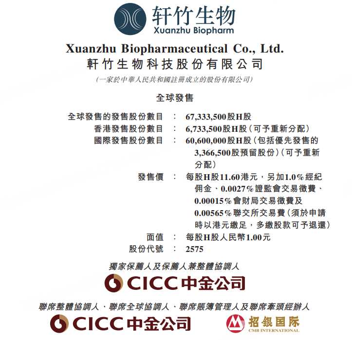 10月6日,軒竹生物-B於10月6日至10月10日招股,該公司擬全球發售6733.35萬股,其中香港發售佔10%,國際發售佔90%,另有15%超額配股權,每股發售價11.6港元。每手500股,預期股份將於10月15日在聯交所開始買賣。