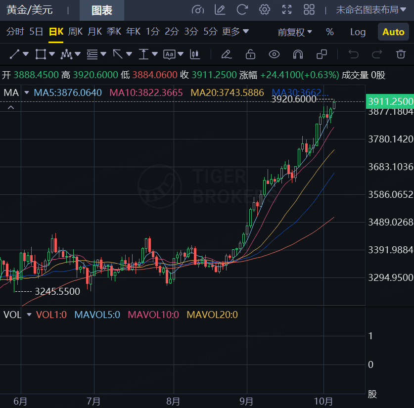 10月6日,由於美國政府持續關門帶來的不確定性加劇以及降息預期升溫,現貨黃金開局維持強勢,一度向上觸及3920美元/盎司,再創歷史新高。此時距離首次突破3800美元關口僅不到10天。