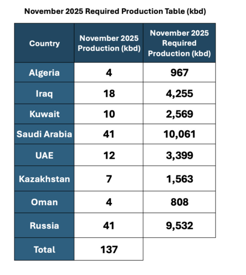 表格顯示,俄羅斯和沙特的配額爲4.1萬桶/日、伊拉克爲1.8萬桶/日、阿聯酋爲1.2萬桶/日、科威特爲1萬桶/日、哈薩克斯坦爲0.7萬桶/日、阿曼和阿爾及利亞爲0.4萬桶/日。