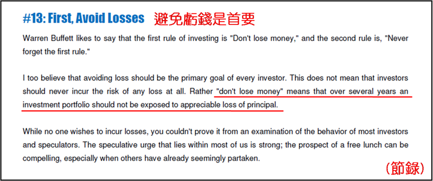 對投資者而言,不論是跟風金融機構的選股,或是自行分析選股,最終都是想獲利,但卡拉曼卻指出,爭取回報前卻要緊記《安全邊際》的第十三個思想,就是“避免虧錢是首要”。正如美國著名投資者,亦有“股神”美譽的巴菲特所言經常說投資有兩大定律,首要是“不要虧錢”(Never lose money),第二條則是“永遠牢記第一條”(Never forget rule No. 1)。卡拉曼完全贊同這觀點,但不代表投資不應承受可能虧錢丁點兒的風險。“不要虧錢”更合宜的理解是在漫長的投資生涯,我們持有的投資組合不應曝露在可能導致本金重大損失的情況。