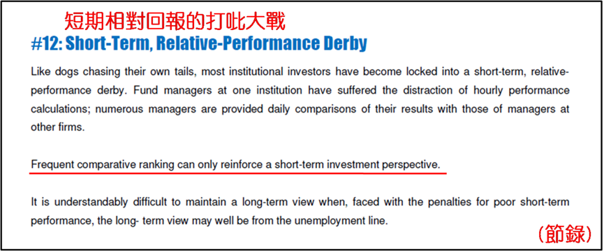 高頻的相對排名只會更加強化經理們要去追求短期投資表現的視野,於是難以取得長期投資有好的回報表現。誠然面對短期投資表現欠佳便要受罰,試問還要誰會冒着失業的風險,而堅持爭取長期投資有好表現呢?倘若散戶沒有了解機構投資者上述生態狀況,盲目跟隨她們的選股取向,便仿如在外地自駕遊卻沒有地圖或導航系統。雖然這樣行你未必不能到達目的地,不過走了“冤枉路”花上額外時間則在所難免;與此同時,也要承擔中途迷失並最終不能抵步的風險。