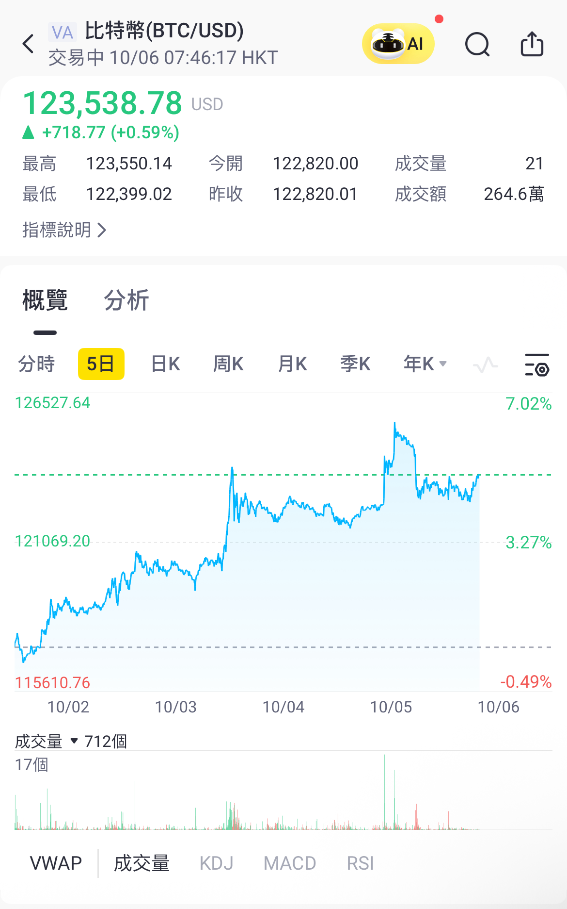 在美國政府停擺引發的不確定性中,投資者尋求避險資產,比特幣週日創下歷史新高,短暫突破 12.5 萬美元。