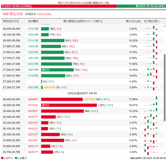 過去5日,恒指牛證合計約6611萬港元資金淨流出套現;恒指熊證則合計約1.25億港元資金淨流入。街貨分佈方面,至上週五,恒指牛證街貨佔比約69.9%,分佈在收回價26400點至26700點之間,累計相當約3224張期指合約;恒指熊證街貨在收回價27200點至27700點之間,累計相當約2077張期指合約。