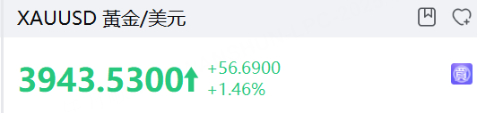 現貨黃金日內突破3940美元創新高,現報3943美元/盎司,升幅1.46%。