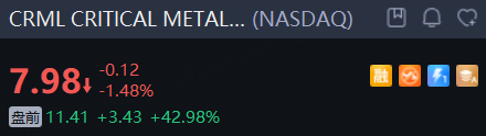 CRITICAL METALS CORPORATION 一度飆升超90%,現漲43%。消息稱特朗普政府計劃入股該公司,以便控制稀土資源。同時,相關概念股普漲,截至發稿,NioCorp Developments漲超17%,American Resources漲超13%,USA Rare Earth漲超5%,Energy Fuels漲超3%。