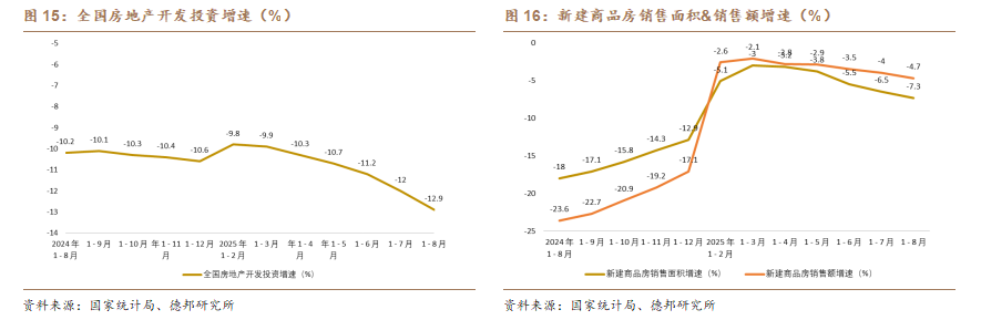 與亮眼的總量數據形成鮮明對比的,是房地產領域的持續承壓。1—8月份,全國房地產開發投資6.03萬億元,同比下降12.9%,其中,住宅投資4.64萬億元,下降11.9%;1—8月份,新建商品房銷售面積5.73億平方米,同比下降4.7%;其中住宅銷售面積下降4.7%。新建商品房銷售額5.50萬億元,下降7.3%;其中住宅銷售額下降7.0%。當前我國房地產行業正處於深度調整階段,投資與銷售持續下行,行業整體仍在去庫存與風險化解的過程中。