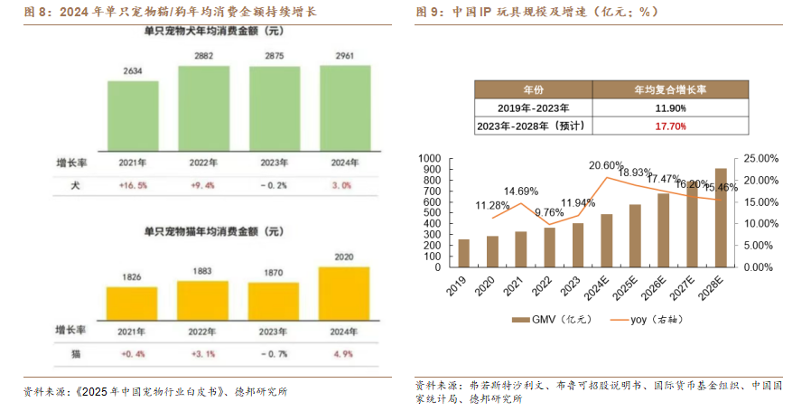 情感共鳴&社交陪伴——寵物/潮玩:隨着單身經濟和銀髮經濟的發展,消費者對情感陪伴和社交的需求在持續增長,其中寵物陪伴和潮玩產品成爲新的消費需求。①寵物經濟:根據派讀寵物白皮書,2024年我國寵物市場規模達3002億元,同比+7.5%,2021-2024年CAGR爲+6.4%,處於快速提升階段,預計2027年市場規模有望超4000億元,養寵的情況價值日益凸顯。②潮玩IP:以泡泡瑪特爲代表的IP衍生潮玩品牌正在快速出圈,相較於遊戲、觀影等其他IP形式,潮玩這類輕量級IP產品具備較低的單次消費門檻和隨機抽卡等社交玩法能快速獲得情緒反饋,正在成爲新的情緒價值類消費產品。