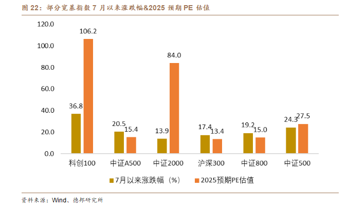 價格端的企穩回升不僅是短期市場波動的結果,更是市場對於供需關係改善與產業結構優化的預期集中體現。隨着無序擴張的產能逐步出清,行業集中度提升,價格下行壓力得到緩解,市場信號開始由“惡性競爭”轉向“價值迴歸”。這一變化在企業層面表現爲利潤率和現金流的修復,在宏觀層面則強化了對經濟韌性和增長前景的信心。當盈利預期穩步改善,資本市場的風險溢價自然趨於收窄,投資者風險偏好得到提振,進而推動估值體系逐步修復。這一傳導鏈條表明,價格修復不僅是行業層面的良性循環,更是資本市場回暖的重要前提和宏觀經濟轉型中的關鍵環節。以寬基指數的漲跌情況和估值變化爲例,7月以來科創100指數漲幅最高達36.8%,同時PE估值也達到了106.2倍,顯示出股票市場對於科技類高估值板塊的偏好。