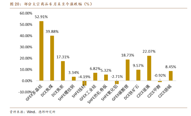 “反內卷”相關政策迅速出臺之後,對市場情緒的提振程度更加顯著。大宗商品價格多數上漲,衆多品種價格得到明顯修復。其中多晶硅價格漲幅最大,6月末至今漲幅達52.91%;焦煤、焦炭、碳酸鋰和玻璃等大宗商品也有較大漲幅。由於政策出臺時間較短,實效有限,所以短期內大宗商品價格行情的修復主要依賴市場情緒提振,而展望未來,我們認爲大多數大宗商品仍將回歸基本面定價。因此,供給端限制不足且需求持續走弱的商品價格回升仍有難度,而供給有一定限制或需求維持增長的品種價格預計能夠受益相關政策刺激維持價格韌性。