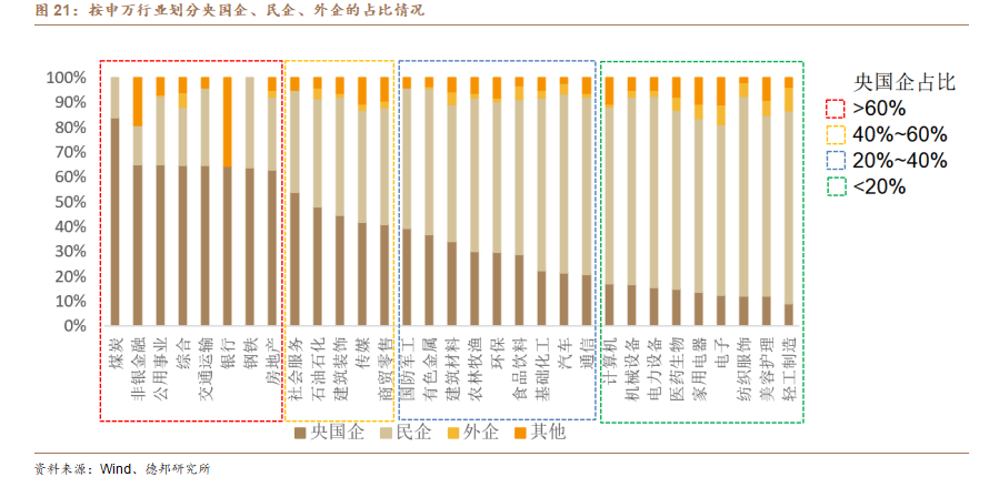 3)從內卷範圍來看,上一輪主要聚焦傳統重工業行業,本輪“反內卷”領域範圍除了煤炭、有色金屬、化工等行業外,外沿或將擴展至光伏、鋰電、汽車等新興製造業;從行業屬性來看,煤炭、大金融、公用事業、交運、鋼鐵、地產等板塊央國企佔比較高(超60%),通過行政手段實現供給側出清的概率較大,紡織服飾、輕工製造、電力設備、機械設備、美容護理、醫藥生物、汽車等板塊民企佔比較高,通過市場化出清的概率較大。