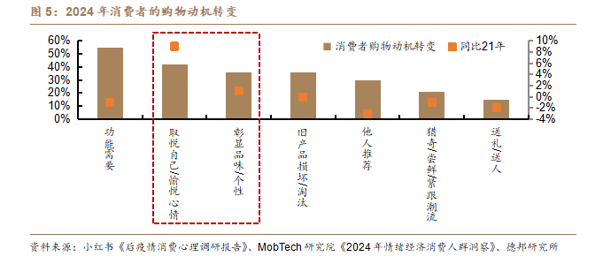 傳統消費以“白酒”爲代表,在人口和經濟的高增速時代,以價增和量漲爲行業擴容的核心支撐,主要以滿足家庭生活和社交活動的基礎需求爲主;而新消費則將重心從“物質消費”走向“精神消費”,不侷限於某一個具體行業,更加註重情緒價值。根據小紅書調研報告,2024年消費者功能需要仍佔首位,但情緒價值需求更加突出,“取悅自己”、“彰顯個性”的消費動機提升最快,佔比較2021年分別提升9%、1%。
