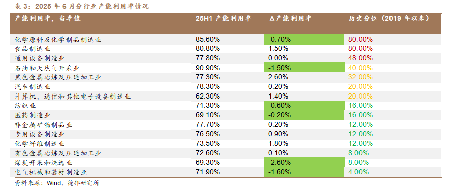2)多行業產能利用率仍處低位:從產能利用率的歷史分位數水平來看,電氣機械和器材製造業、煤炭開採和洗選業、有色金屬冶煉及壓延加工業和化學纖維製造業的產能利用率處於2019年以來的較低水平。從產能利用率的修復來看,黑色金屬冶煉及壓延加工業、化學纖維製造業和食品製造業的產能利用率在修復,而煤炭開採和洗選業、電氣機械和器材製造業和石油和天然氣開採業行業產能利用率仍在下行。