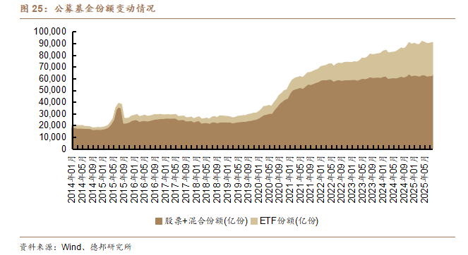 此外,Wind數據顯示,2024年8月至2025年8月,公募基金主動管理產品(股票+混合產品)的份額增加了700億份,但同期被動管理產品ETF的份額增加了4039億份,資金向透明化、工具化產品遷移已成趨勢性特徵。