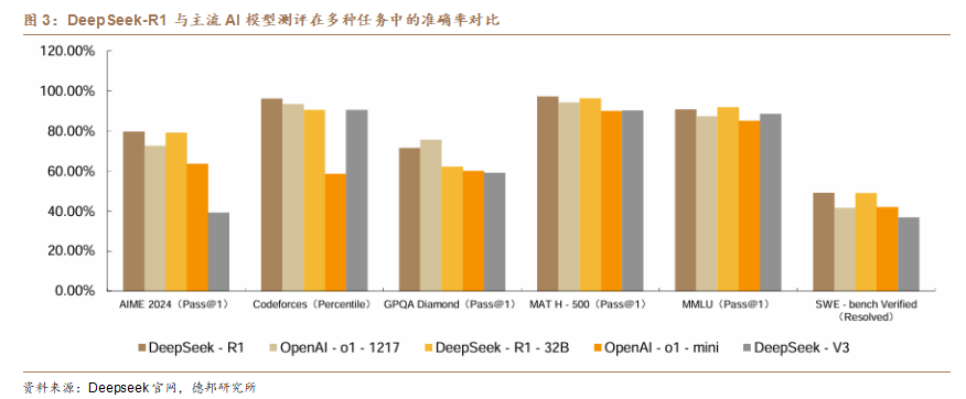 AI技術正式從實驗室走向大規模商業化應用。國內方面,字節以重金投流的方式打造豆包等爆款應用,根據量子位智庫,豆包2024年全年累計下載量已接近1.9億,在全年累計用戶規模/月新增用戶規模/活躍用戶規模中的佔比均超50%;2025年1月20日,DeepSeek發佈人工智能大模型R1,憑藉較少算力資源實現了和全球頂尖AI模型相當的效果,“堆算力”的傳統路徑被打破,引發AI研發領域巨震。DeepSeek系列模型以開源、低成本、高性價比等特徵快速縮小中美大模型之間的差距,在國內推動AI大模型平權,諸如用友網絡、泛微網絡等應用廠商;華爲雲、阿里雲等雲廠商;海光信息、華爲昇騰等芯片廠商紛紛接入DeepSeek系列模型。
