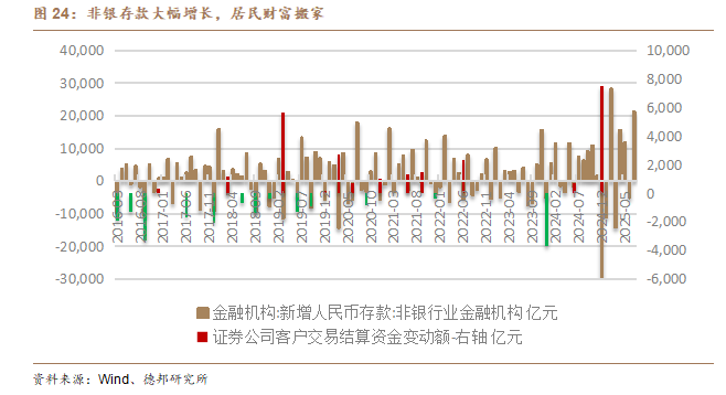 與歷史上“集中炒股”不同,本輪資金呈現“多點開花”特徵,同步流向ETF、債基、固收+等多個領域。央行數據顯示,截至今年7月,非銀機構存款新增4.7萬億,或反映出當前利率債價格下降,固收相對吸引力有所減弱,這與前文股債收益差接近歷史底部的核心邏輯一致。此外,上交所數據顯示,今年7月,A股市場新開戶數達196.36萬戶,同比增長70.54%,環比增長19.27%。