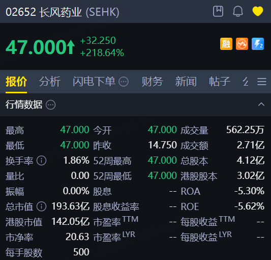10月8日,長風藥業上市首日大幅高開逾218%,股價報47港元;不計手續費,中籤一手賺超16000港元;此前公開發售階段獲近6700倍認購,一手中籤率1%。