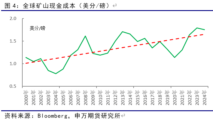 根據彭博統計的主要礦企財報數據,全球銅礦山現金成本(C1)逐年上升。2000年時,主要礦山現金平均成本僅爲1.0美分/磅左右,隨着高品位礦脈開採枯竭,全球礦山品位逐年下降,現金成本也逐年提升,2024年主要礦企的平均現金成本攀升至約1.75美分/磅。隨着全球需求的逐年增加,可以商業開採的礦山平均品位將進一步下降,礦山開採成本也逐年增高,也需要銅價逐年走高以獲得利潤回報。根據全球研究機構(Wood Mackenzie、CRU、彭博)的估計,全球銅礦完全成本(C3)90%分位線大約在8,600 - 8,900 美元/噸(約3.90 - 4.05 美元/磅)。