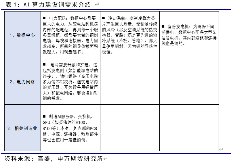 高盛在2024年3月的報告中預測,到2030年,數據中心對銅的新增需求將從2023年的約20萬噸/年增長至50萬噸/年。該報告指出,AI數據中心每兆瓦的用銅量比傳統數據中心高出約80%,主要原因是更密集的佈線和高效率的冷卻系統。此外,支持數據中心的電網建設也將帶來額外的需求。