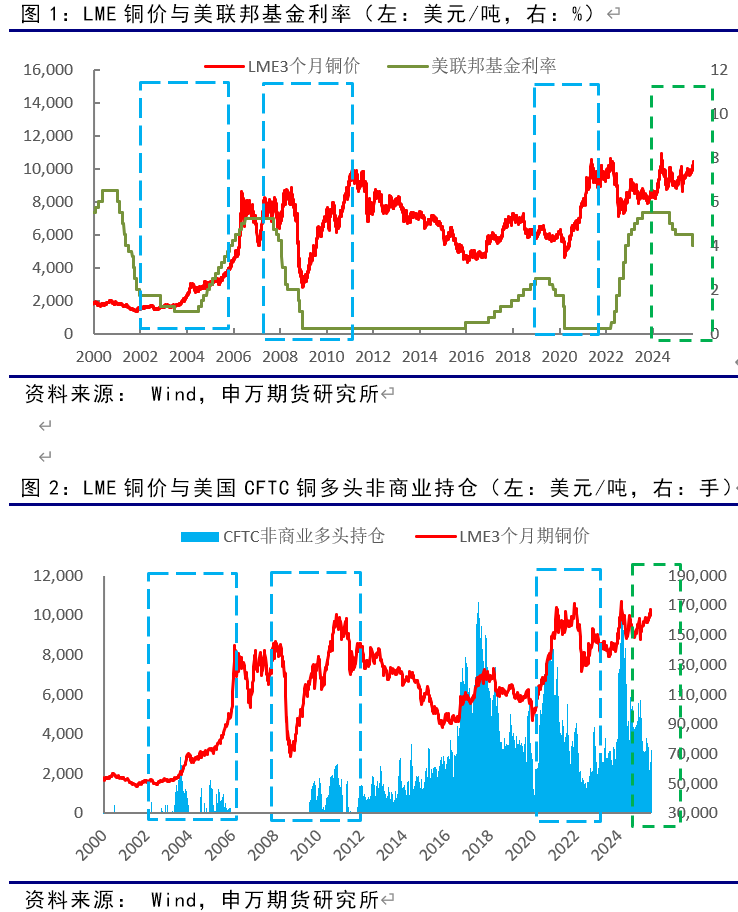 2003年、2009年和2020年三次銅的牛市起漲點,均是美聯儲利率降至低點。美聯儲低利率往往導致美元走弱,並伴隨銅價的走強,呈現的是美元與銅價的負相關性,每次銅價牛市均彰顯了低利率時代銅的金融屬性。