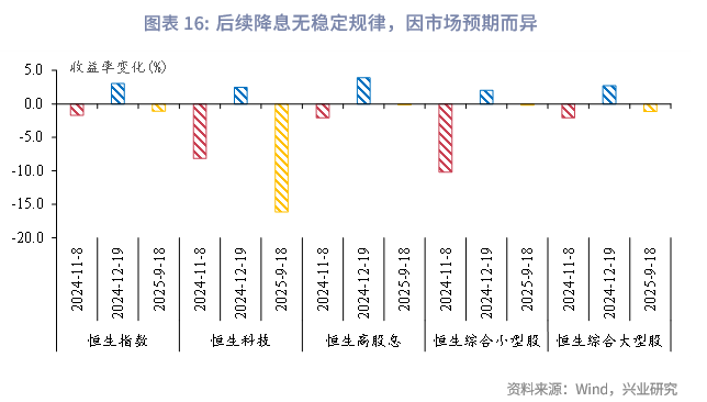 我們選取本輪最近的3次後續降息[5]分析,我們選取(T±5交易日)作爲觀察窗口。從圖16可以看出,三次後續降息後港股市場並未呈現穩定的漲跌規律。這表明,後續降息對市場的實際影響,仍需結合當時的預期數據與宏觀背景進行具體判斷。