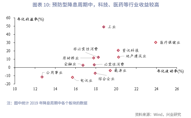在行業層面,不同類型的降息週期呈現出明顯的結構性差異。如圖9所示,在衰退型降息中,市場風險偏好下降,具備防禦屬性的板塊如公用事業、必選消費等通常相對抗跌,其穩定的盈利與需求韌性提供了一定安全邊際。而在預防型降息中,科技、醫藥等行業不僅受益於分母端折現率下行帶來的估值提升,也往往迎來投融資環境的改善;此外,工業類板塊在融資成本下降的推動下,也可能實現盈利與估值的雙重提振(圖10所示)。