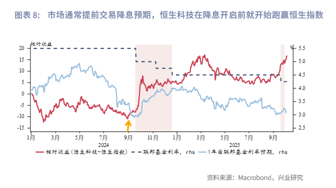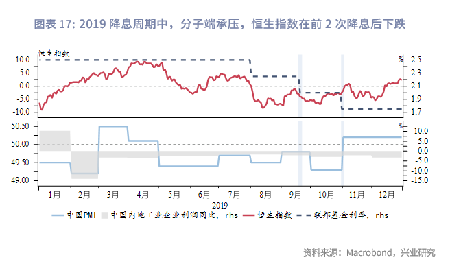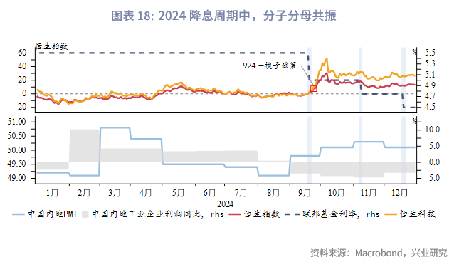究其根本,美聯儲降息主要作用於資產定價中的分母端(無風險利率),而分子端的盈利表現,尤其是中國基本面的影響,往往同樣關鍵。如圖17-18所示,同樣是美聯儲降息,2019年雖處於美聯儲降息週期,分母端條件趨於寬鬆,但由於當時國內經濟基本面偏弱,企業盈利持續承壓,分子端的拖累導致港股仍出現大幅下跌,這正是典型的分子端主導定價的案例。與之形成對比的是2024年,在美聯儲降息預期提供分母端支撐的背景下,中國內地“924”一攬子政策進一步成爲關鍵驅動力,該政策通過降低存量房貸利率等舉措,從根源上改善居民收入預期與企業盈利前景,進而推動分子端與分母端實現正向共振,共同促成了港股的顯著反彈。