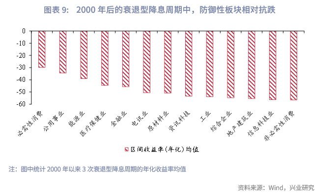3)行業層面:遵循“衰退防禦、預防成長”的演繹邏輯,在衰退型降息中,市場風險偏好回落,具備防禦屬性的板塊如公用事業、必選消費等通常表現更佳, 而在預防型降息中,科技、醫藥等高成長行業佔優。