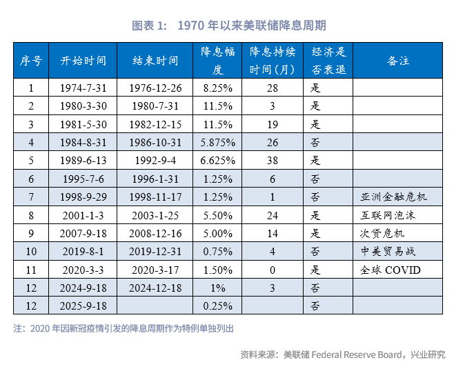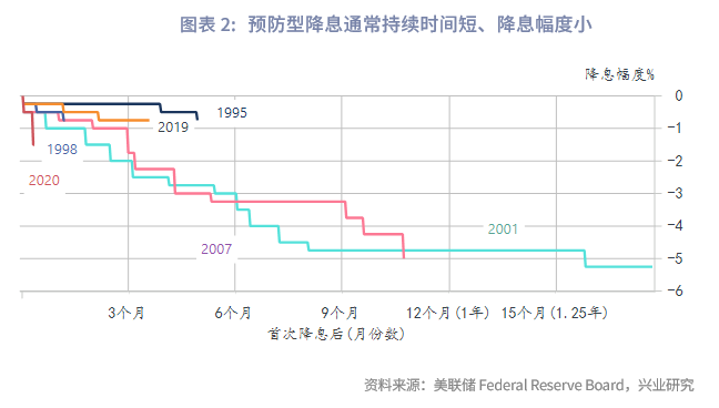 不同降息週期的特徵:從歷史經驗看(如圖2所示),預防型降息(如1984、1995、1998、2019和2024年)通常表現爲持續時間短、降息幅度小;而衰退型降息(如1974、1981、1989、2001和2007年)則往往持續時間更長、幅度更大。此外,2020年因新冠疫情引發的降息週期具有時間極短、節奏極快、斜率陡峭等特徵,故作爲特例單獨列出分析。