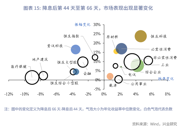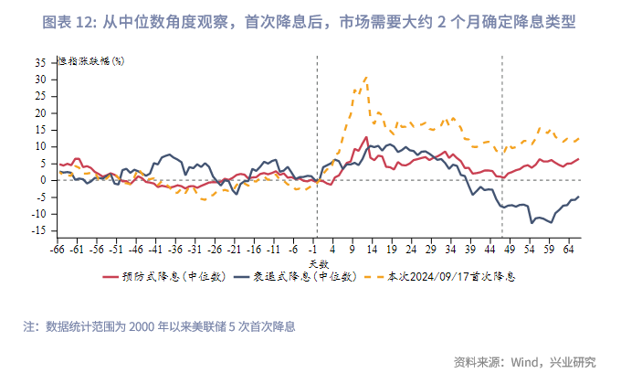 基於歷史數據的中位數統計,我們發現市場通常需要約2個月時間來初步識別降息週期的性質(預防型或衰退型,如圖12)。因此,我們重點考察了首次降息後44個交易日(約2個月)與66個交易日(約3個月)的窗口表現。數據顯示: