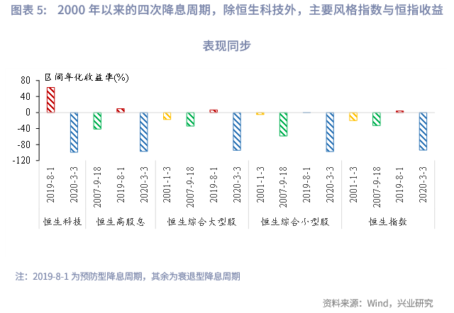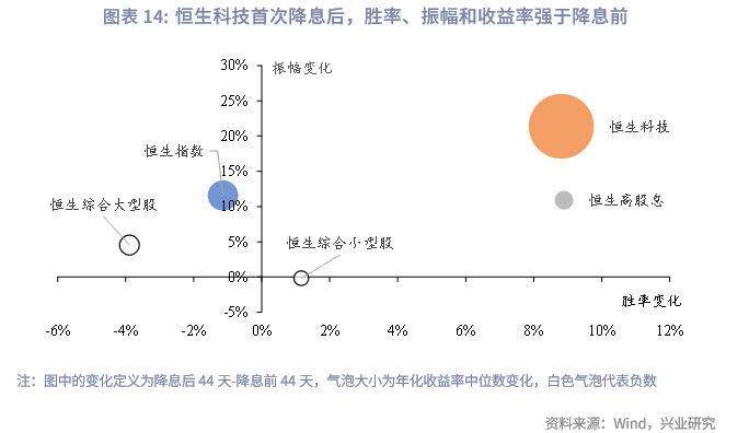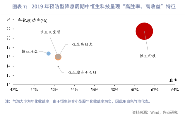 2)風格方面:除恒生科技指數外,其餘風格(如市值風格下的大盤與小盤,以及紅利風格)在歷次降息週期中均未走出獨立行情。預防型降息週期中,恒生科技指數呈現出“高勝率、高收益”的特徵。