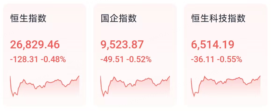 10月8日週三,港股三大指數全日弱勢震盪。截至收盤,截至收盤,恒生指數跌0.48%,報26829.46點,全日成交額爲1738.03億港元;恒生國企指數跌0.52%,報9523.87點;恒生科技指數跌0.55%,報6514.19點。