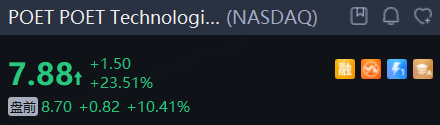 AI光學模塊公司 POET Technologies Inc 盤前續漲超10%,昨日大漲超23%,宣佈完成7500萬美元投資,加速其在AI連接解決方案領域發展。