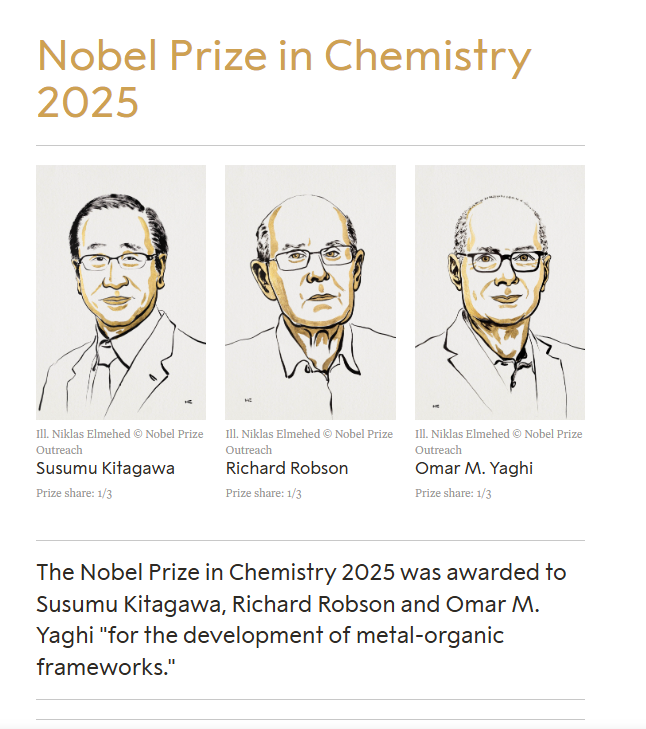 當地時間10月8日,瑞典皇家科學院決定將2025年諾貝爾化學獎授予北川進(Susumu Kitagawa)、理查德·羅布森(Richard Robson)以及奧馬爾·M·亞吉(Omar M. Yaghi)三位科學家,以表彰其在金屬有機骨架開發領域的貢獻。獲獎者將平分1100萬瑞典克朗(約合836萬元人民幣)獎金。