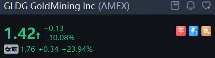 金價屢創新高,黃金股普漲, GoldMining Inc 暴漲近24%, 哈莫尼黃金、金田、AngloGold Ashanti Ltd ADS漲超3%,科爾黛倫礦業漲2.8%。