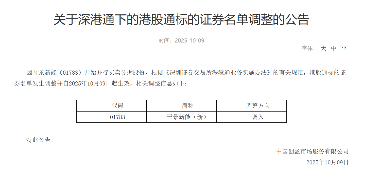 深交所公告,港股通標的證券名單發生調整並自2025年10月09日起生效,調入晉景新能(新)。