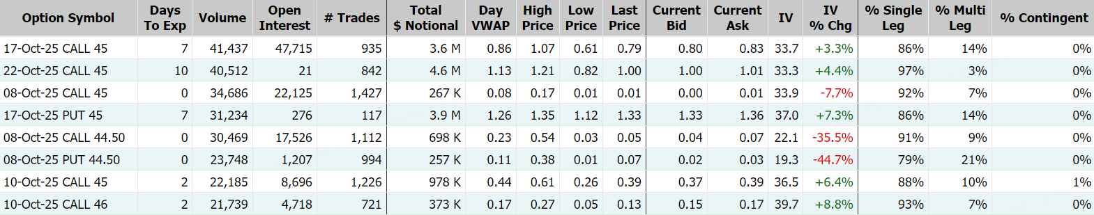白銀ETF(iShares)當日期權成交122.88萬張,較90日均量放大2.5倍,看漲期權佔比78.1%,其中於10月17日到期的45美元行使價的看漲期權成交居前,成交超4.1萬張。 $SLV 20251017 45.0 CALL$