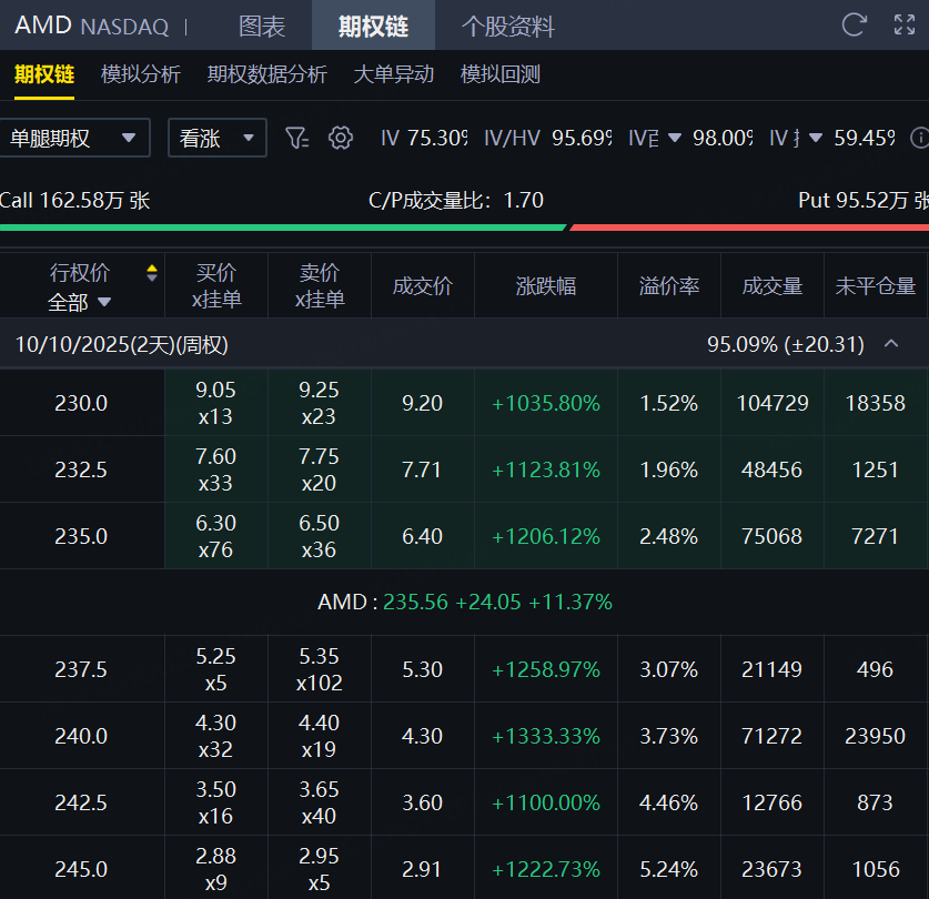 期權方面,AMD當日期權成交258.09萬張,位居期權總成交榜單榜首;看漲期權佔比攀升至63%,其中於10月10日到期的230美元行使價的看漲期權成交居前,成交逾10萬張。此外,從期權鏈上看,AMD多張Call單大漲逾1000%。 $AMD 20251010 230.0 CALL$