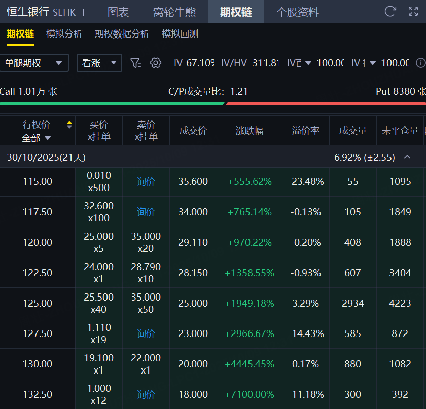 期權方面,滙豐控股期權半日成交超4.8萬張,其中於12月30日到期95港元行使價的認沽期權成交居前,成交超3500張;恒生銀行期權半日成交超2萬張,其中於10月30日到期145港元行使價的認沽期權成交居前,成交超3800張;此外,從期權鏈上看,恒生銀行多張認購期權大漲數十倍。