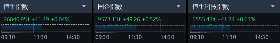 10月9日,港股三大指數盤初探底後快速回升轉漲,截止午盤,恒生指數微幅上漲0.04%,國企指數、恒生科技指數分別上漲0.52%及0.63%,三者終結此前3日連跌行情。