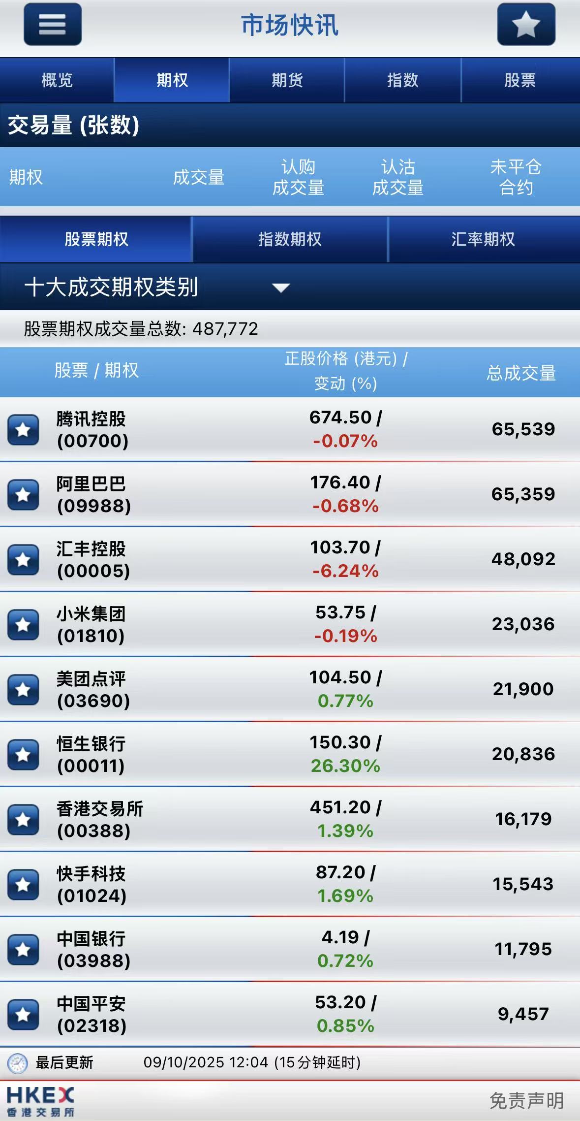截止午間收盤,港股期權半日成交48.78萬張,其中,騰訊控股成交量居首,期權成交6.55萬張;阿里巴巴-W名列次席,期權成交超6.53萬張;滙豐控股位居第三,期權成交超4.8萬張。