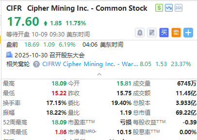加密礦企普漲,Cipher Mining $CIFR 漲超6%,Bitfarms $BITF 漲超3%, $IREN 漲超1%;