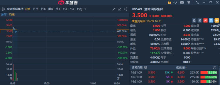 港股金葉國際集團正在暗盤交易中,此前一度漲超800%,創年內新股漲幅紀錄!截至發稿,金葉國際集團現漲600%,報3.5港元/股,中籤一手賬面浮盈15000港元,最新總市值約14億港元。該股預計將於10月10日正式掛牌上市,配售結果將於今日晚間披露。