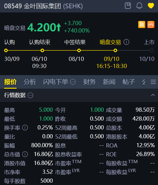 10月9日,金葉國際集團暗盤飆漲740%,總市值近17億港元;不計手續費,中籤一手賺18500港元;公司每股定價0.5港元,每手5000股,將於10月10日(週五)正式掛牌交易。