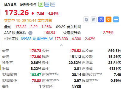 華盛資訊10月9日訊,熱門中概股普跌,阿里巴巴、百度均跌超4%,京東跌近3%,拼多多跌近2%,