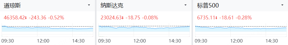週四,美股三大指數收跌。截至收盤,標準普爾500指數跌0.28%,報6735.11點;納斯達克綜合指數跌0.08%,報23024.63點;道瓊斯工業平均指數跌0.52%,報46358.42點。