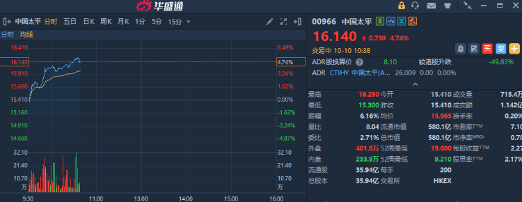 華盛資訊10月10日訊,港股保險板塊集體走強,中國太平漲近5%,新華保險漲逾4%。