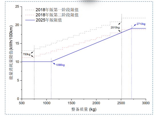 根據GB 36980.1—2025標準調整車重限值基準質量至1780kg,設置質量拐點爲2710kg及1090kg,並按整備質量分段設定能耗限值:整備質量2710kg車型限值19.1kWh/100km,中間質量段採用公式計算。四驅車型、三排座椅車型限值係數爲1.03,高性能車型額外乘以1.2。