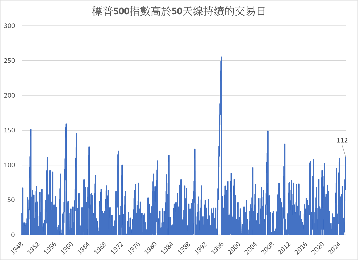 總括而言,從歷史統計觀察,標普500在50天線上運行超過100個交易日後的後市表現普遍向好,顯示當前的“慢牛”格局仍可能延續。然而,投資者仍需留意宏觀環境及估值風險,只宜保持中度樂觀。若未來能見到經濟數據與企業盈利持續配合,標指或有望在中長期內再創新高。